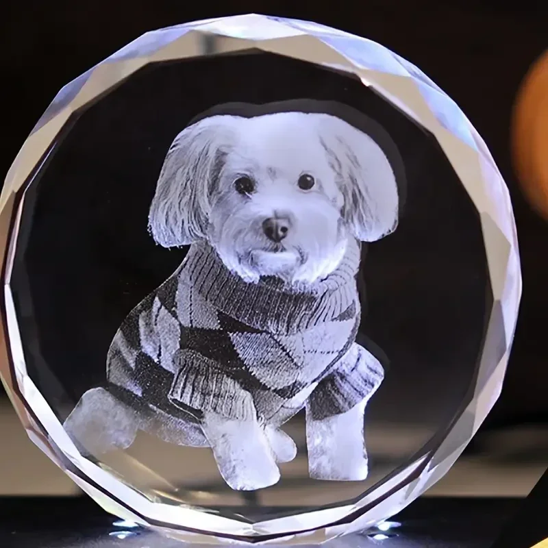 Dit mooie ronde kristal, kunt u laten personaliseren met een foto van uw overleden of huisdier.