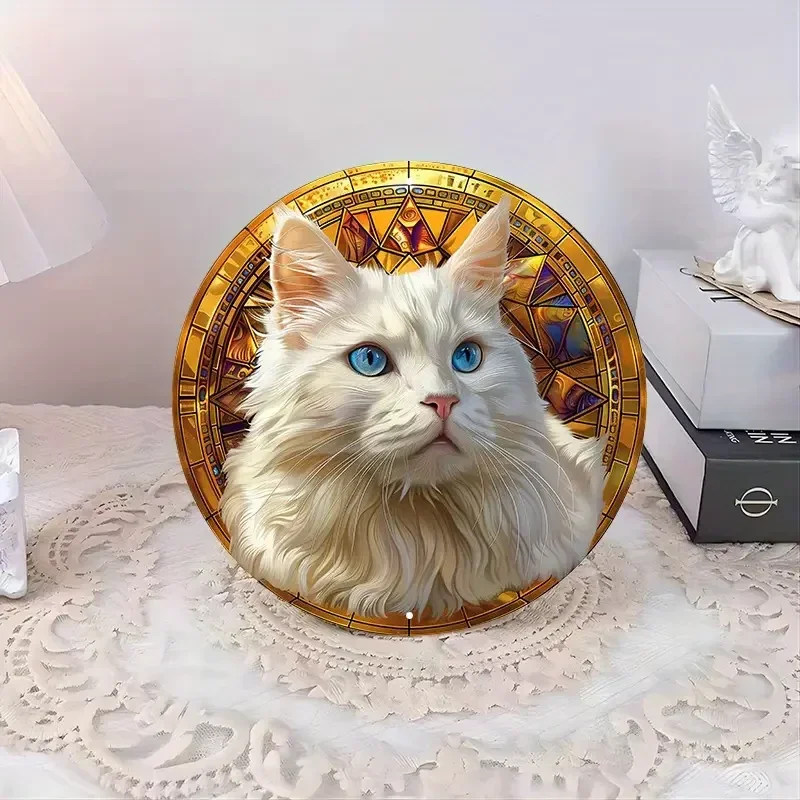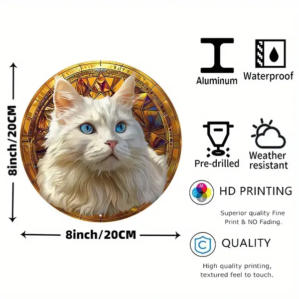 Aluminium metalen bord met een witte kat en een glas-in-lood achtergrond - 20,32 cm rond, waterdicht en weerbestendig wanddecor met voorgeboorde gaten, HD-printen